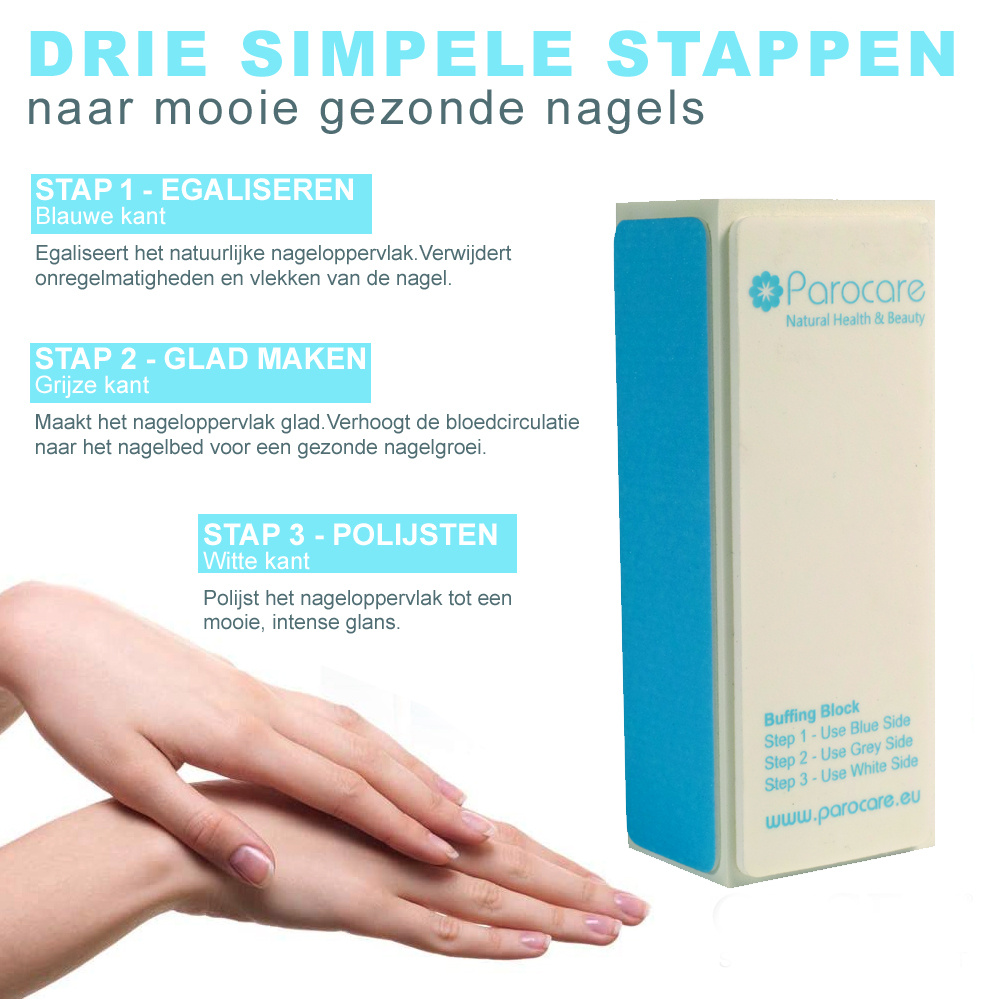 Wilt u prachtige, gezonde nagels zonder nagellak? Dit polijstblok geeft uw nagels een intense en langdurige glans, stimuleert de groei en verstevigt de nagels. Dankzij de dubbele witte polijstkanten gaat het extra lang mee en biedt het een nog stralender resultaat.